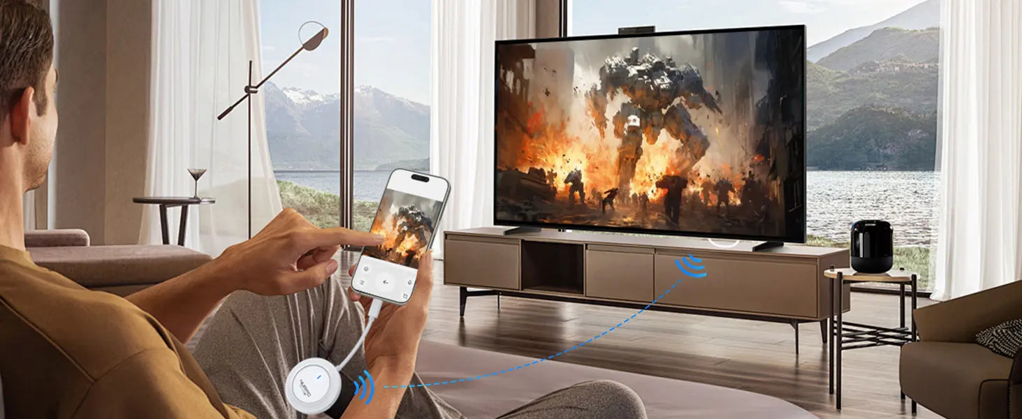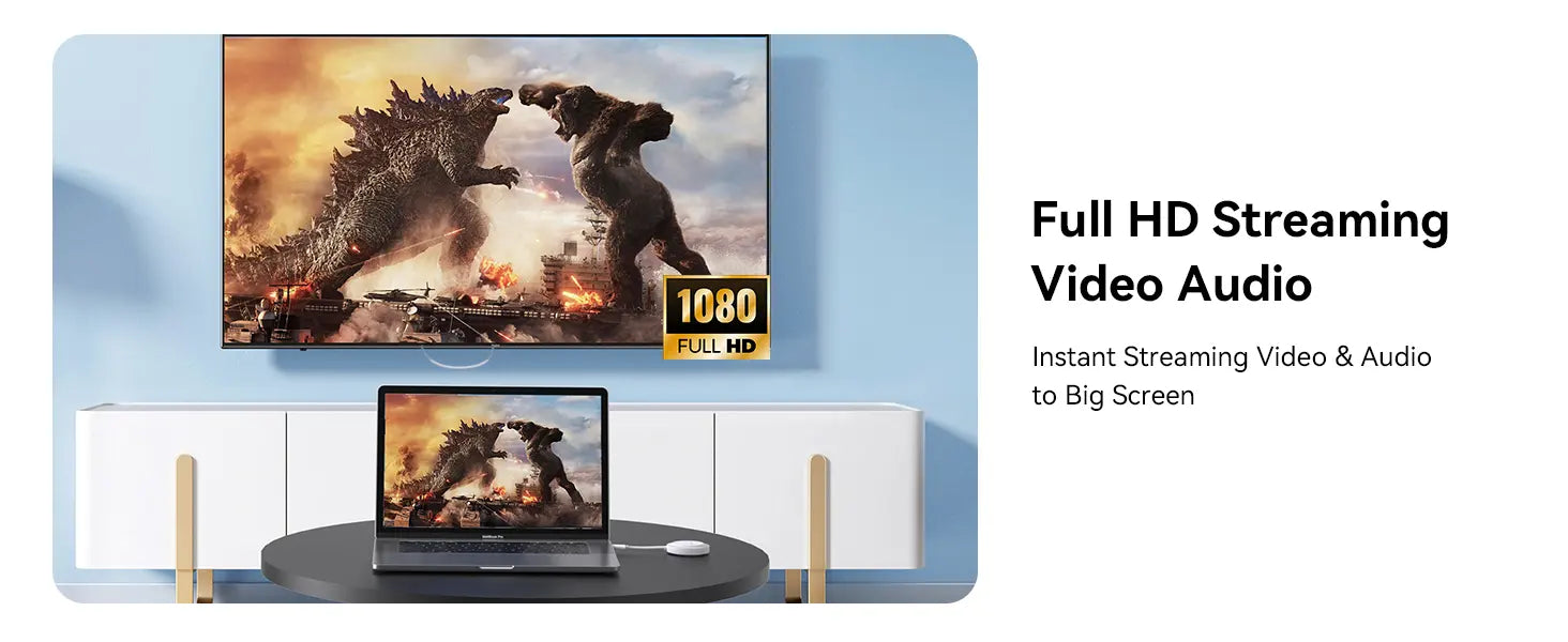 -1080P Ultra HD Resolution: The wireless HDMI display dongle adapter uses a high-performance chip and H2.65 decoder +1.2 dual-core processor design, supports 1080P@60Hz full HD video resolution, no compression, and artifacts. Using this screen mirroring adapter for TV allows you to transfer the content to the big screen, also enjoy the exceptional visual experiences, perfect for speechings, meetings, watching movies and playing games.