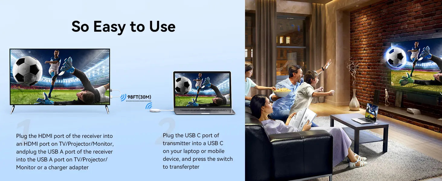 -Plug & Play Wireless HDMI Extender: This Wireless HDMI Transmitter and Receiver is plug and play, no need Wi-Fi/Bluetooth connections, or APP/Software installnations. The wireless HDMI display dongle adapter is designed with a switch on besides, after installed, you can connect or disconnect the wireless display adapter with one click, it's very convenient to use. (NOTE: The USB C port of the laptop needs support DP Alt mode)