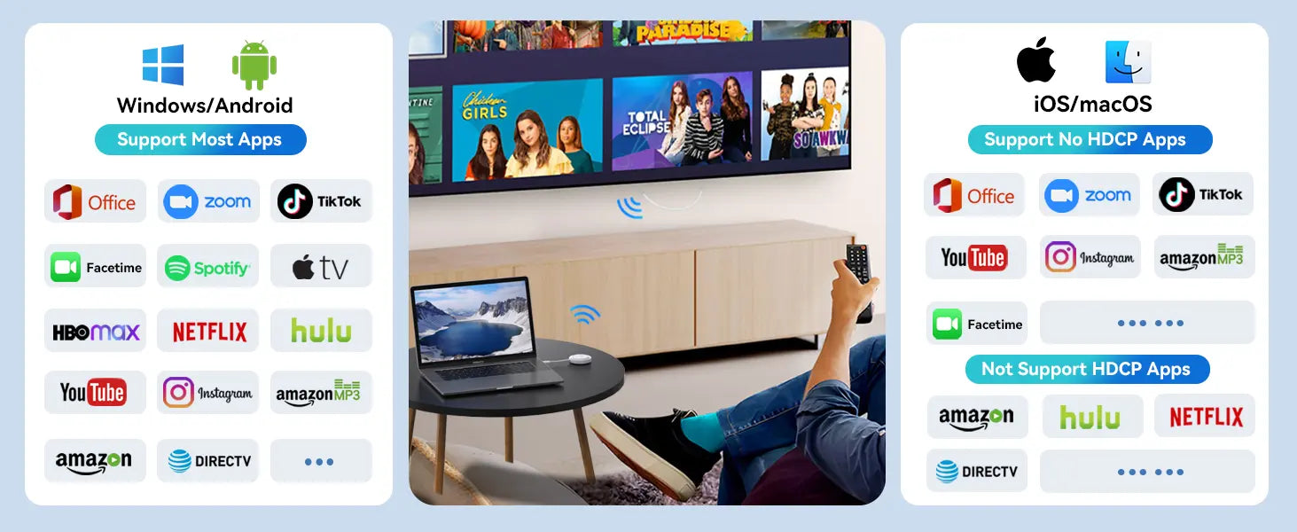 3. For iOS and macOS devices, this HDMI wireless transmitter and receiver supports streaming apps that do not require HDCP, such as Zoom, YouTube, TikTok, Facetime, and other non-subscription video apps.