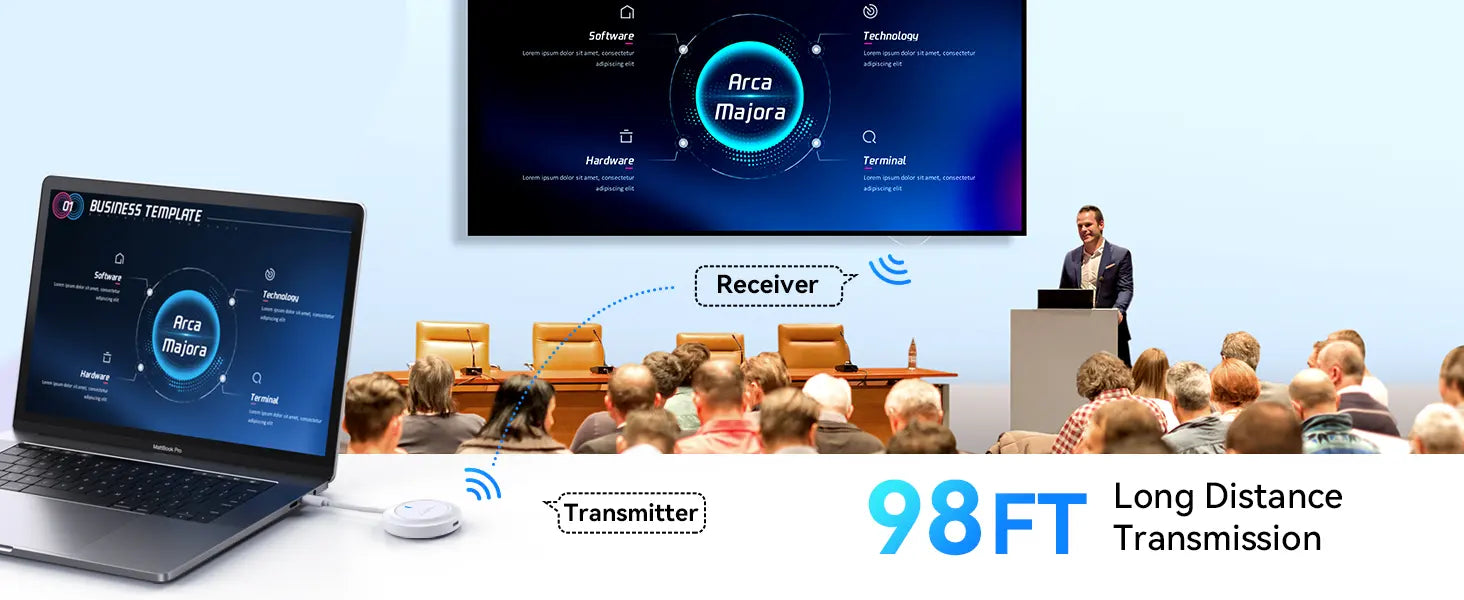 -5G Fast Streaming Video& Audio: This HDMI transmitter and receiver is built in high-performance 5G WiFi chippest, Making the transmission speed faster and more stable. With our wireless HDMI splitter, you can instantly Transmit audio/video signal to a big screen, refusing to any catons or delay. The transmission RANGE can be reached 98 Feet (30 meters), even when passing through walls or obstacles, it maintains a reliable connection(Transmission speed and distance may be a little affected).